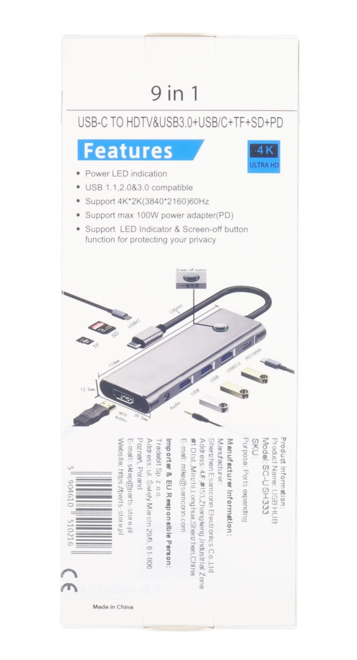 - Stacja Dokująca 9w1 HUB USB 3.0 HDMI Power Delivery 100W 4K 60Hz Przycisk